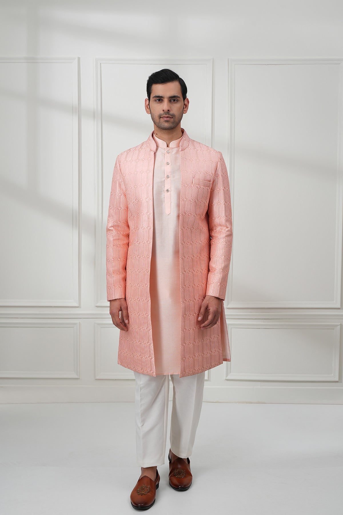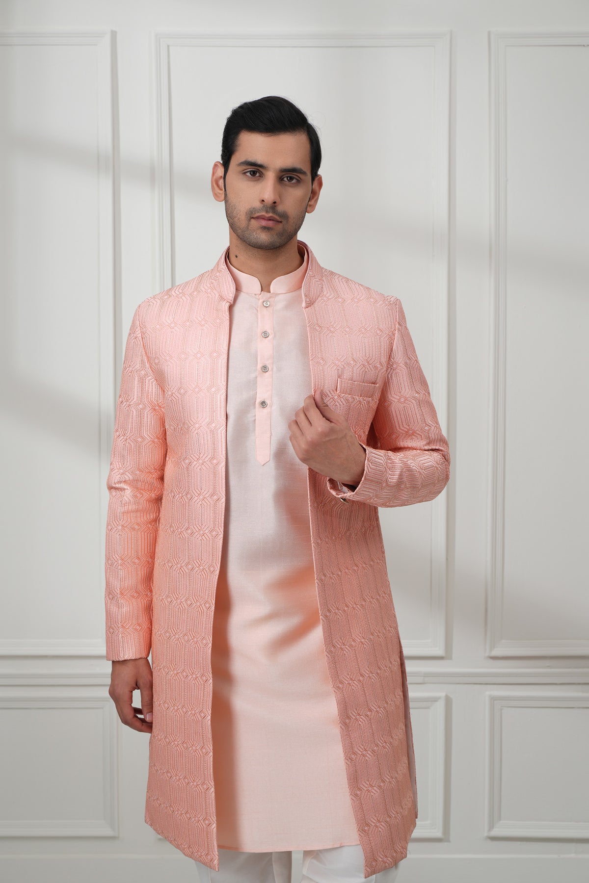 Step into elegance with our Peach Indo Western set. The jacket features tonal silk thread embroidery, adorned with sequins and finished with elegant gold buttons. Paired perfectly with off-white bottoms for a sophisticated ensemble.