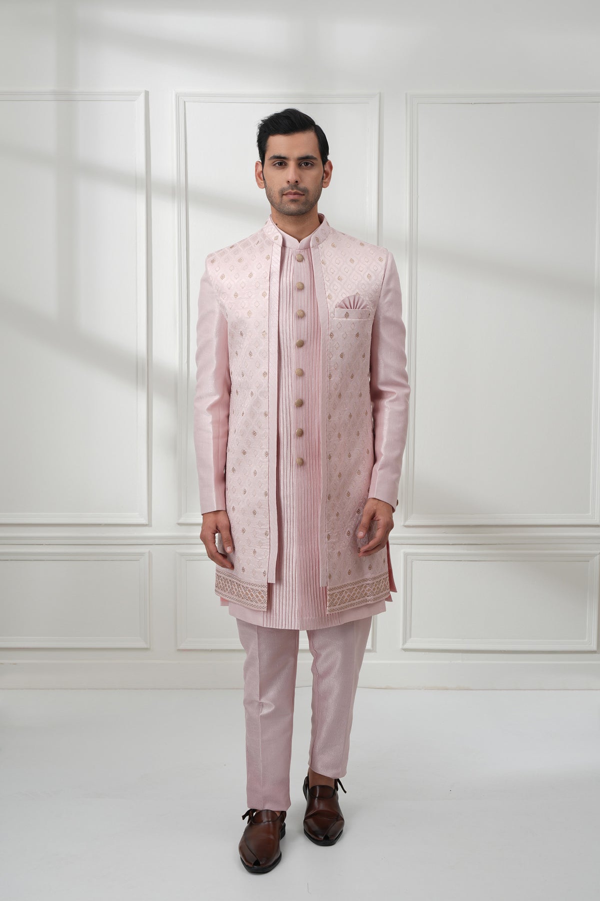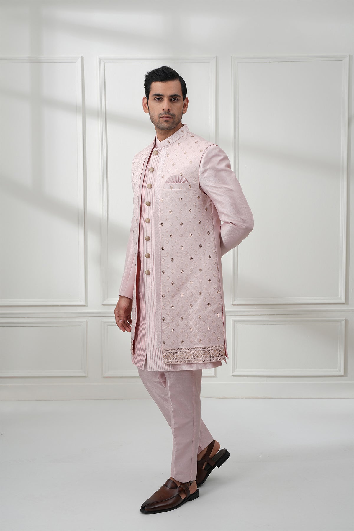Make a statement at any party with our Pink Western ensemble. Crafted from textured raw silk, adorned with zari and Swarovski accents. Featuring fine zari lines, pintuck detailing, and elegant gold buttons